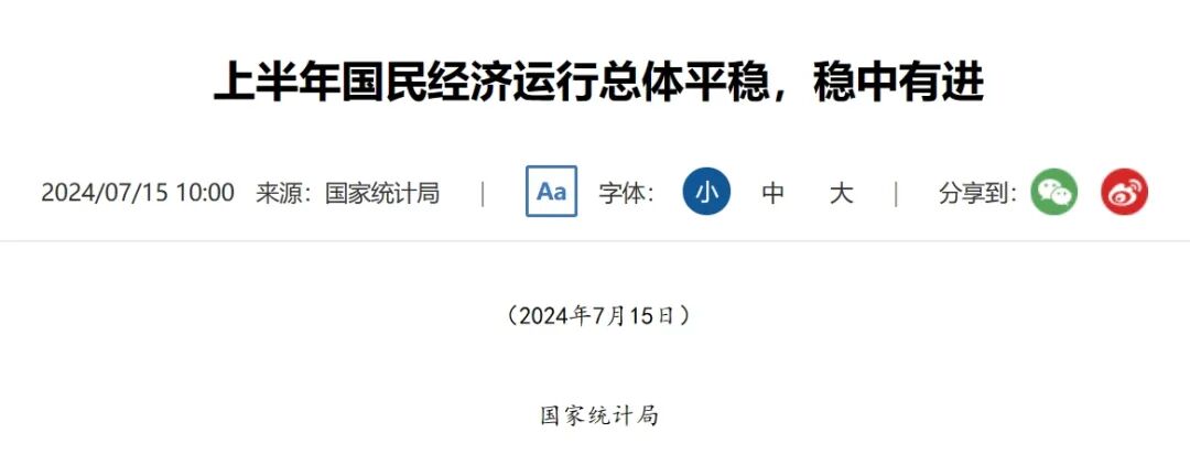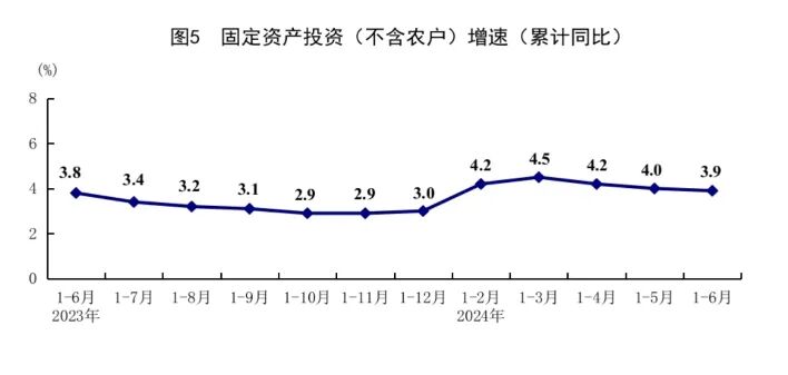 上半年,全国固定资产投资(不含农户)245391亿元,同比增长3.9%;扣除房地产开发投资,全国固定资产投资增长8.5%。分领域看,基础设施投资增长5.4%,制造业投资增长9.5%,房地产开发投资下降10.1%。全国新建商品房销售面积47916万平方米,同比下降19.0%;新建商品房销售额47133亿元,下降25.0%。 分产业看,第一产业投资增长3.1%,第二产业投资增长12.6%,第三产业投资下降0.2%。民间投资增长0.1%;扣除房地产开发投资,民间投资增长6.6%。高技术产业投资同比增长10.6%,其中高技术制造业和高技术服务业投资分别增长10.1%、11.7%。高技术制造业中,航空、航天器及设备制造业,计算机及办公设备制造业投资分别增长38.3%、12.1%;高技术服务业中,电子商务服务业、科技成果转化服务业投资分别增长24.1%、17.4%。6月份,固定资产投资(不含农户)环比增长0.21%。 分地区看,东部地区投资同比增长3.8%,中部地区投资增长4.0%,西部地区投资增长1.0%,东北地区投资增长3.4%。 分登记注册类型看,内资企业投资同比增长3.8%,港澳台企业投资增长5.1%,外商企业投资下降15.8%。 上半年,在以习近平同志为核心的党中央坚强领导下,各地区各部门认真贯彻落实党中央、国务院决策部署,坚持稳中求进、以进促稳、先立后破,有效落实各项宏观政策,国民经济运行总体平稳,稳中有进,生产稳定增长,需求持续恢复,就业物价总体稳定,居民收入继续增加,新动能加快成长,高质量发展取得新进展。 初步核算,上半年国内生产总值616836亿元,按不变价格计算,同比增长5.0%。分产业看,第一产业增加值30660亿元,同比增长3.5%;第二产业增加值236530亿元,增长5.8%;第三产业增加值349646亿元,增长4.6%。分季度看,一季度国内生产总值同比增长5.3%,二季度增长4.7%。从环比看,二季度国内生产总值增长0.7%。 一、夏粮再获丰收,畜牧业总体平稳 上半年,农业(种植业)增加值同比增长4.0%。夏粮生产再获丰收。全国夏粮总产量14978万吨,比上年增加363万吨,增长2.5%。上半年,猪牛羊禽肉产量4712万吨,同比增长0.6%,其中,牛肉、禽肉产量分别增长3.9%、6.3%,猪肉、羊肉产量分别下降1.7%、0.9%;牛奶产量增长3.4%,禽蛋产量增长2.7%。二季度末,生猪存栏41533万头,同比下降4.6%;上半年,生猪出栏36395万头,下降3.1%。 二、工业生产较快增长,装备制造业支撑作用明显 上半年,全国规模以上工业增加值同比增长6.0%。分三大门类看,采矿业增加值增长2.4%,制造业增长6.5%,电力、热力、燃气及水生产和供应业增长6.0%。装备制造业增加值增长7.8%,高技术制造业增加值增长8.7%,增速分别快于全部规模以上工业1.8和2.7个百分点。分经济类型看,国有控股企业增加值增长4.6%;股份制企业增长6.5%,外商及港澳台投资企业增长4.3%;私营企业增长5.7%。分产品看,3D打印设备、新能源汽车、集成电路产品产量同比分别增长51.6%、34.3%、28.9%。6月份,规模以上工业增加值同比增长5.3%,环比增长0.42%。6月份,制造业采购经理指数为49.5%,与上月持平;企业生产经营活动预期指数为54.4%,比上月上升0.1个百分点。1-5月份,全国规模以上工业企业实现利润总额27544亿元,同比增长3.4%。 三、服务业继续恢复,现代服务业发展良好 上半年,服务业增加值同比增长4.6%。其中,信息传输、软件和信息技术服务业,租赁和商务服务业,交通运输、仓储和邮政业,住宿和餐饮业,批发和零售业增加值分别增长11.9%、9.8%、6.9%、6.6%、5.7%。6月份,全国服务业生产指数同比增长4.7%。其中,信息传输、软件和信息技术服务业,租赁和商务服务业,交通运输、仓储和邮政业生产指数分别增长13.5%、9.7%、5.4%。1-5月份,规模以上服务业企业营业收入同比增长8.5%。6月份,服务业商务活动指数为50.2%;服务业业务活动预期指数为57.6%,比上月上升0.6个百分点。其中,航空运输、邮政、电信广播电视及卫星传输服务、货币金融服务、保险等行业商务活动指数位于55.0%以上较高景气区间。 四、市场销售保持增长,服务消费增势较好 上半年,社会消费品零售总额235969亿元,同比增长3.7%。按经营单位所在地分,城镇消费品零售额204559亿元,增长3.6%;乡村消费品零售额31410亿元,增长4.5%。按消费类型分,商品零售209726亿元,增长3.2%;餐饮收入26243亿元,增长7.9%。部分基本生活类和升级类商品销售良好,限额以上单位粮油食品类、饮料类商品零售额分别增长9.6%、5.6%;通讯器材类、体育娱乐用品类商品零售额分别增长11.3%、11.2%。全国网上零售额70991亿元,同比增长9.8%。其中,实物商品网上零售额59596亿元,增长8.8%,占社会消费品零售总额的比重为25.3%。6月份,社会消费品零售总额同比增长2.0%,环比下降0.12%。上半年,服务零售额同比增长7.5%。 五、固定资产投资规模扩大,高技术产业投资增长较快 上半年,全国固定资产投资(不含农户)245391亿元,同比增长3.9%;扣除房地产开发投资,全国固定资产投资增长8.5%。分领域看,基础设施投资增长5.4%,制造业投资增长9.5%,房地产开发投资下降10.1%。全国新建商品房销售面积47916万平方米,同比下降19.0%;新建商品房销售额47133亿元,下降25.0%。分产业看,第一产业投资增长3.1%,第二产业投资增长12.6%,第三产业投资下降0.2%。民间投资增长0.1%;扣除房地产开发投资,民间投资增长6.6%。高技术产业投资同比增长10.6%,其中高技术制造业和高技术服务业投资分别增长10.1%、11.7%。高技术制造业中,航空、航天器及设备制造业,计算机及办公设备制