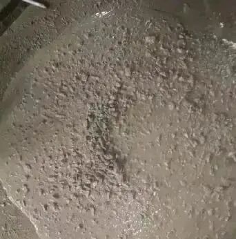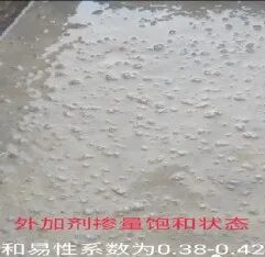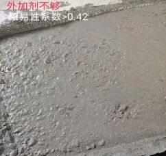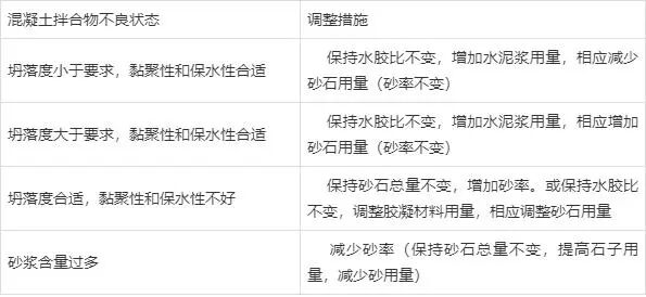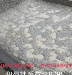 (1)流动性指混凝土拌合物浇筑后,在重力或机械振捣的作用下,能够流动并均匀充满模板的能力。混凝土的流动性较差,表现为其坍落扩展度小,流速慢,混凝土表面缺少浆体;混凝土流动性优异,表现为流速快,混凝土表面浆体充盈,且有光泽。(2)黏聚性指混凝土拌合物各组成材料之间具有一定的黏聚力,在施工工程中,不发生分层、离析现象。(3)保水性指混凝土拌合物能够保持其内部水分不会流失的性能,良好的保水性使混凝土不会发生离析、分层,内部水析出到表面。工作性的三个指标相辅相成、相互影响。一般来讲,混凝土流动性大,黏聚性和保水性就会降低;混凝土黏聚性好,流动性就会降低。所以,使混凝土新拌合物同时满足工作性的三个指标,在它们之间找到一个平衡点,提高混凝土拌合物的匀质性。在施工现场打出完美的混凝土状态是求之不得的事情,但是实际情况却是总会遇到各种各样的问题。从下图的混凝土状态可以看出哪些问题?(1)四周泌的厉害,细看小碎石也不少,说明砂率偏小;(2)凸起的大碎石表面无浆,包裹差,一方面和泌有关,再次证明砂率小;(4)虽然混凝土泌浆,但放大照片,混凝土表面无气泡,也说明含气偏小;(6)混凝土颜色虽然不发青,但发黄不明显,说明减水剂敏感性不算强,适应性还可以。(2)由于砂石都差,比表面积大,需要包裹的浆多,显得胶材远不足;(3)放大图片看,上面有少许黑班,这是外加剂敏感或外加剂掺量已过的表现,可混凝土没打开,无浆,证明碎片比表面积大,或堤浆不足,也说明外加剂敏感;(4)图中部有发黄,泌几个点,说明葡加的有点多,混凝土铲起来困难(5)混凝土表面无气泡,而且周的碎石不裹浆,说明气不足,或增稠多。(3)增稠加的太多,浆是死的,里面的气出不来,表面也无气泡;(5)右下角有点泌,左下角大碎石的,两者说明碎石级配不好,大碎石多,小石少;(6)因为气大,增稠多,混凝土坍损大,混凝土颜色变的很深;(7)因为气大,增稠也多,看似包裹还可以,好施工,但强度低的很;(9)总体分析,外加剂低价中标,很敏感,为了便于施工,降敏感,采用了几个没有办法的办法,而且很便宜,但都有害,如:加大气泡,加葡钠,加大量糊精;(10)加了气和增稠,混凝土好像加了气一样,而且里面的气也无法排出,容重轻的很,自然强度也低的很。搅拌楼生产完毕一车或者一槽砼料后,搅拌车取样前应快速搅拌3~5分钟后再从搅拌车里放料取样到斗车里。取完样后斗车不能拉动超过50米距离,观察斗车表面浆体包裹情况和砼料表面气泡情况。大致分为以下4种现象:现象一:如图1所示,表面小气泡密集,石子迅速沉底并表面有黄色水泌出,则判定为外加剂严重过掺,应马上降外加剂用量调整(此时和易性系数一般为<0.38)。现象二:如图2所示,表面大气泡过多伴有少量小气泡,石子也沉底有清色水泌出,静止5分钟后气泡消失,则判定为外加剂略过饱和点,用水量过高导致,应马上降低生产线用水量(提高生产线砂石含水率)调整(此时和易性系数一般为<0.38)。现象三:如图3所示,表面大小气泡适中,石子没有明显的沉底、泌水,则判定为外加剂掺量饱和,此时砼料的和易性、施工性能最佳,经时损失小(此时和易性系数一般为0.38~0.42)。现象四:如图4所示,表面无气泡,料干巴巴,倒出来流动性差,则判定为外加剂掺量不足,应尽快调整配比外加剂用量(此时和易性系数一般为>0.42)。(1)取样抽检鉴定完后,应尽快按取样确定好的外加剂掺量、砂率推算出来正在使用配合比的外加剂掺量、砂率进行系统调整,并填写配合比调整记录单。(2)配合比系统调整完后,应对不同时间生产的混凝土进行取样抽检、监控工作,以防因各原材料随生产使用量变化、砂石含水率的波动,导致砼料状态的变化情况,如发现外加剂过掺、料干、石子多等情况,应及时取样重新进行配合比的鉴定和调整。混凝土生产过程中,由于某种原因造成混凝土拌合物不能满足要求时,如:骨料含水率、颗粒级配合粒径发生明显变化;胶凝材料需水量出现较大变化;减水剂减水率发生变化;混凝土拌合物坍落度变化明显;其他原因造成混凝土状态不能满足施工要求。需要调整混凝土配合比,但调整时要求有足够的理由和依据,防止随意调整,见表1。